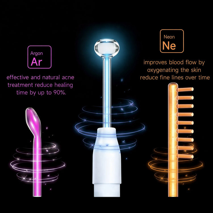 The NovaWand uses dual gas electrodes—neon to stimulate collagen and argon to oxygenate and clear acne. Mild high-frequency currents gently revitalize your skin, enhancing microcirculation for a natural glow. With six interchangeable glass tips, our device targets fine lines, breakouts, and precise facial areas. Instead of spending thousands of dollars at the esthetician's, use NovaWand for an at-home spa experience.